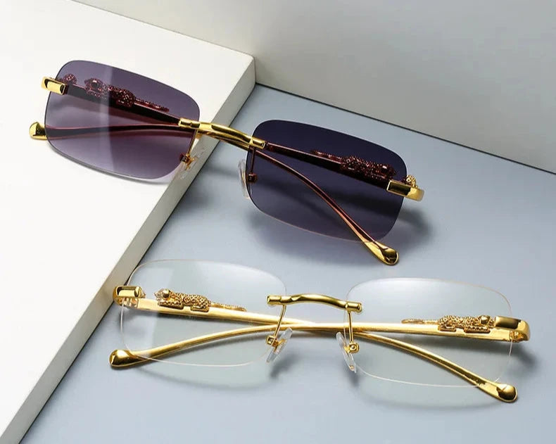 With its luxurious vintage design, these rimless square sunglasses are perfect for both men and women. The fashion-forward metal leopard head adds a touch of sophistication, making them a popular choice for travel and driving. Stay stylish and protected from the sun with these designer sunglasses.